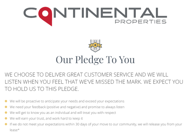 For almost two decades, Continental Properties has provided a pledge of service to the residents of its Springs Apartments communities, and it has backed that pledge by allowing any resident who is not satisfied with their experience within the first 30 days to cancel their lease. Learn more.