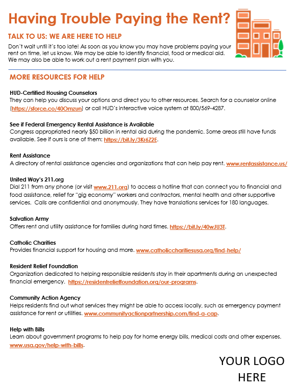 Customizable Rental Assistance Flyer. This flyer lists a number of organizations that offer rental assistance and organizations that can connect renters in financial distress with financial assistance. It can be customized with your companies logo and shared with renters who are experiencing financial distress.