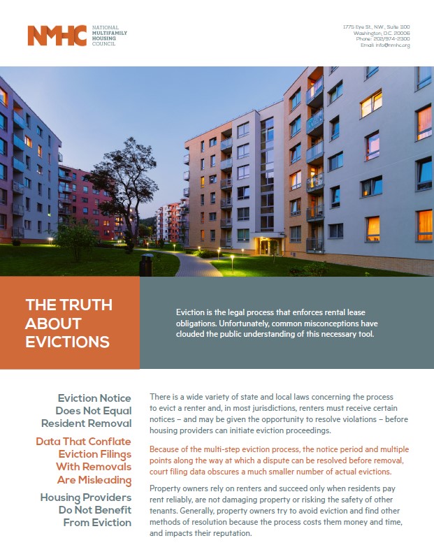 Eviction is the legal process that enforces rental lease obligations. Unfortunately, common misconceptions have clouded the public understanding of this necessary tool. To help counteract some of these misconceptions, NMHC has created an educational primer that details the resident removal process step-by-step.