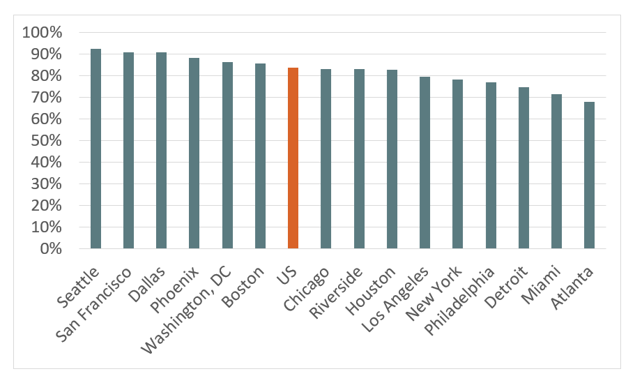 Metro areas are split a little more evenly on where respondents are currently caught up on rent payments, with the U.S. total among renters comes in at 83.8 percent in the most recent survey. Those metros with the highest share of renters that were current on payments include Seattle, San Francisco and Dallas. While these figures from the Household Pulse Survey represent all renters, we know that apartment occupancy in San Francisco is down compared to pre-pandemic levels, reaching 92.6 percent in September according to RealPage. So, if they can’t afford to maintain their rent in coastal metros like Seattle and San Francisco, they may be searching for a more affordable rental unit elsewhere and those that stay are able to pay. Detroit, Miami and Atlanta come in at the bottom of the list for share of renters currently caught up on rent payments. Employment or income loss could certainly still be a factor here, with these metros facing exposure in manufacturing and leisure and hospitality.