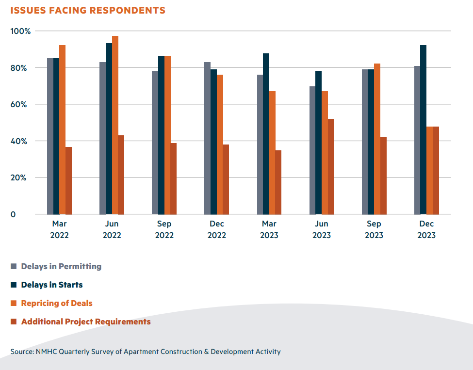 NMHC’s Quarterly Survey of Construction & Development Activity tracks a number of issues that developers and builders face. In 2023, survey results showed persistent delays in starts as deals were repriced throughout the year and more project requirements were added on.
