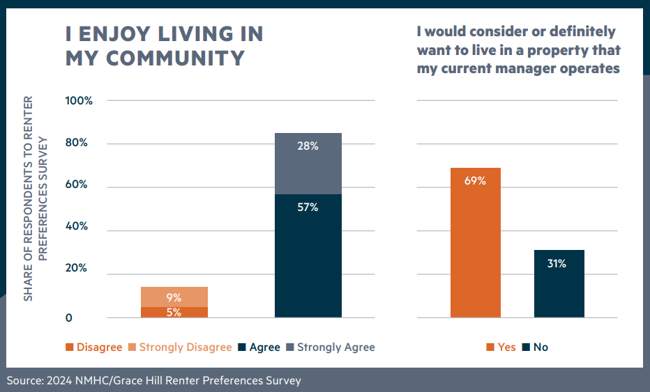 Multifamily management companies continue to strive to deliver positive living experiences through quality accommodations and renter-focused processes and policies. And for many renters, they are not only meeting but exceeding the mark. In fact, the majority of respondents to the 2024 NMHC/Grace Hill Renter Preferences Survey said they felt their well-being is important to their management companies and that staff demonstrates a culture of respect and kindness—factors that contribute to a positive sense of community.