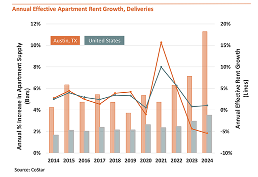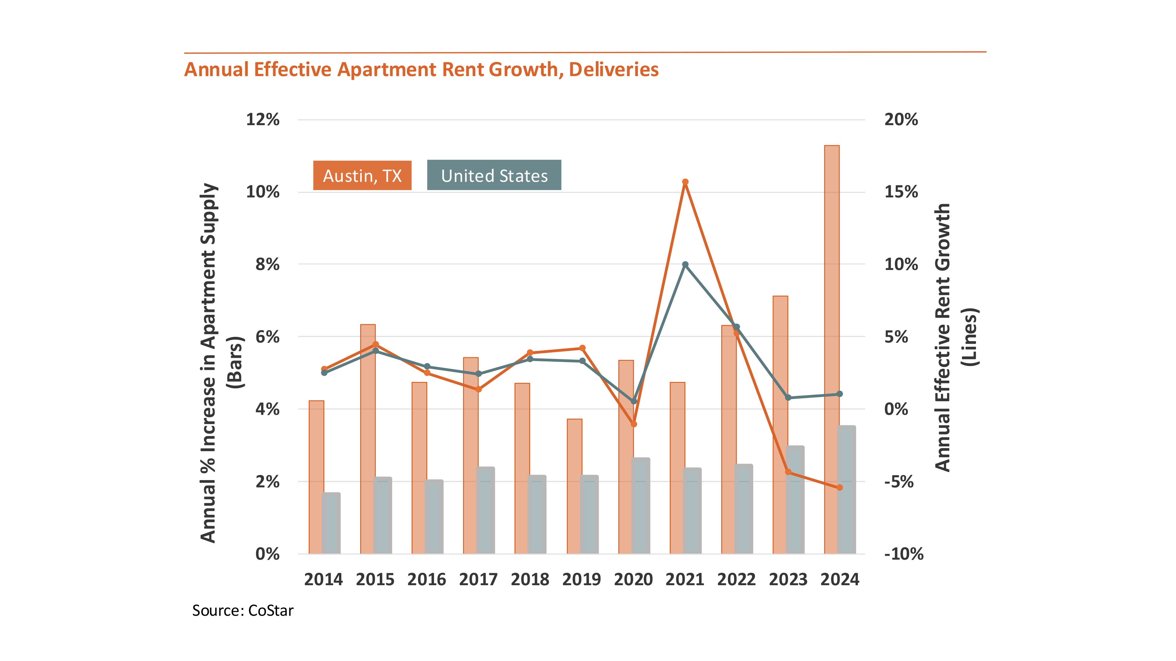 Even the Post highlights a market where the increase in housing supply has already resulted in rent decreases—Austin, Texas. Austin went from less than 10,000 housing units completed in 2018 to nearly 35,000 completions in 2024 and rent growth has gone from 3.4% year-over-year in 2018 to -3.9% year-over-year, according to CoStar. Ironically, according to the Post, Austin is the market with the highest concentration of pricing software use.