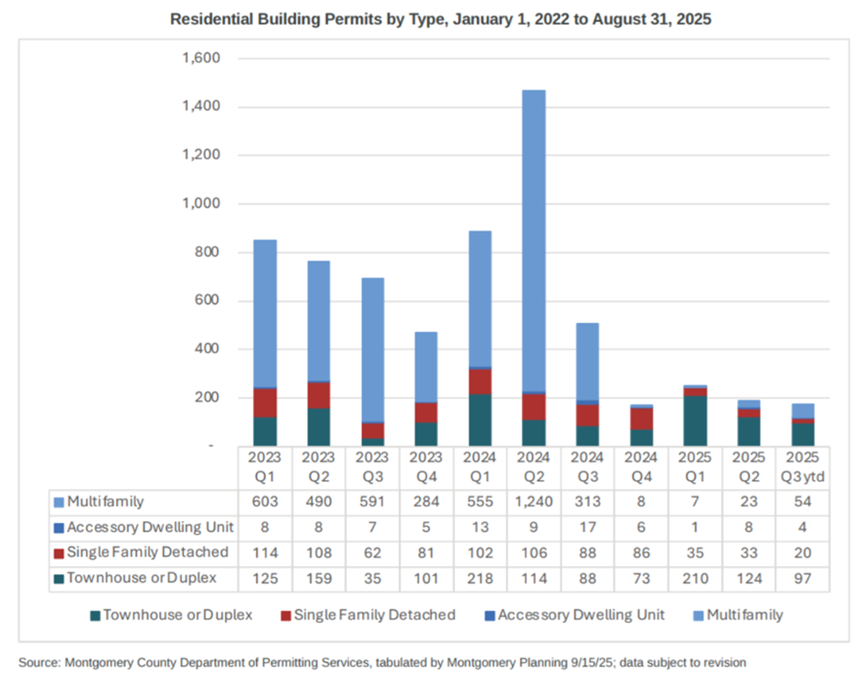 “Last summer, data released by the county’s Planning Department showed that during the first three quarters in which the county’s rent control law was fully in effect (2024 Q4, 2025 Q1 and 2025 Q2), MoCo’s number of multifamily units permitted were 8, 7 and 23. In the seven preceding quarters, the number of multifamily units permitted ranged from 284 to 1,240, marking an all-out collapse.