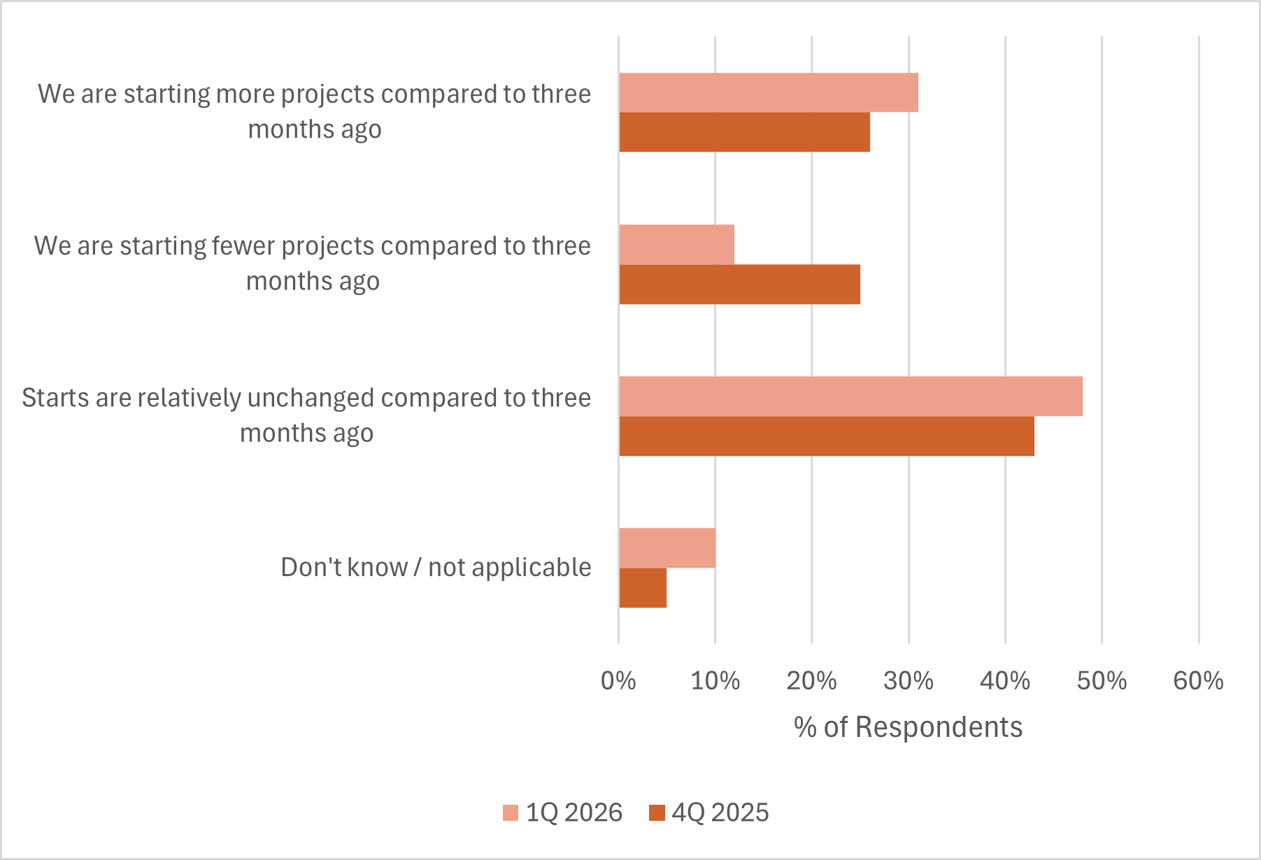 The builders and developers that responded to NMHC's March 2026 Construction Quarterly Survey mostly reported (48% of respondents) that multifamily starts are relatively unchanged compared to three months ago. Thirty-one percent of respondents, meanwhile, reported starting more projects than three months earlier, while just 12% reported starting fewer projects (down from 25% in December).