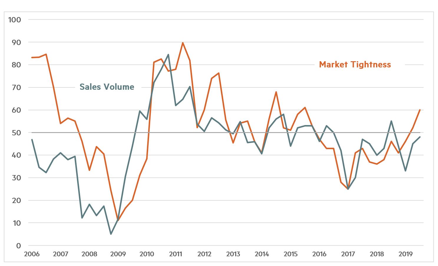 1 A Market Tightness Index reading above 50 indicates that, on balance, apartment markets around the country are getting tighter; a reading below 50 indicates that market conditions are getting looser; and a reading of 50 indicates that market conditions are unchanged.