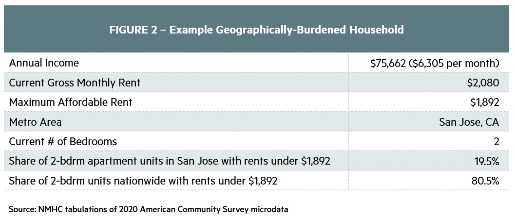 Figure 2 below shows a hypothetical San Jose apartment household that could only afford 19.5% of two-bedroom units within the metro area in 2020 without being considered cost-burdened ($1,892 per month rent). However, that same household would be able to afford 85.5% of all two-bedroom apartments nationwide with its $75,000+ annual income. In other words, this household likely would no longer be considered burdened if (1) San Jose housing costs dropped significantly closer to the national average or (2) they moved to a metro area with lower housing costs.
