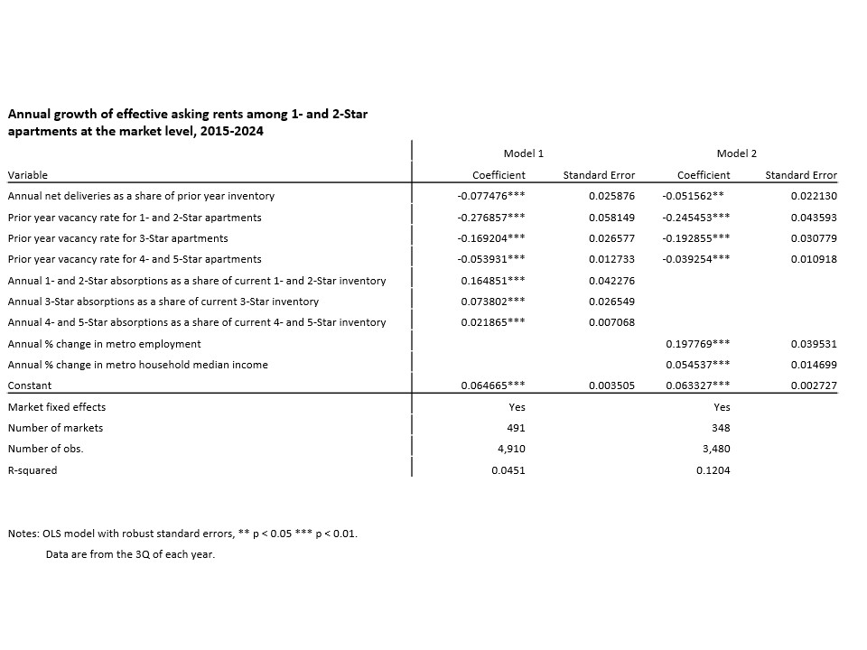 In both of our model specifications, which use absorptions and (separately) employment growth and income growth as measures of demand, we found that higher apartment vacancy rates in the previous year, across all product types, were associated with lower rates of annual rent growth for 1- and 2-Star apartments.