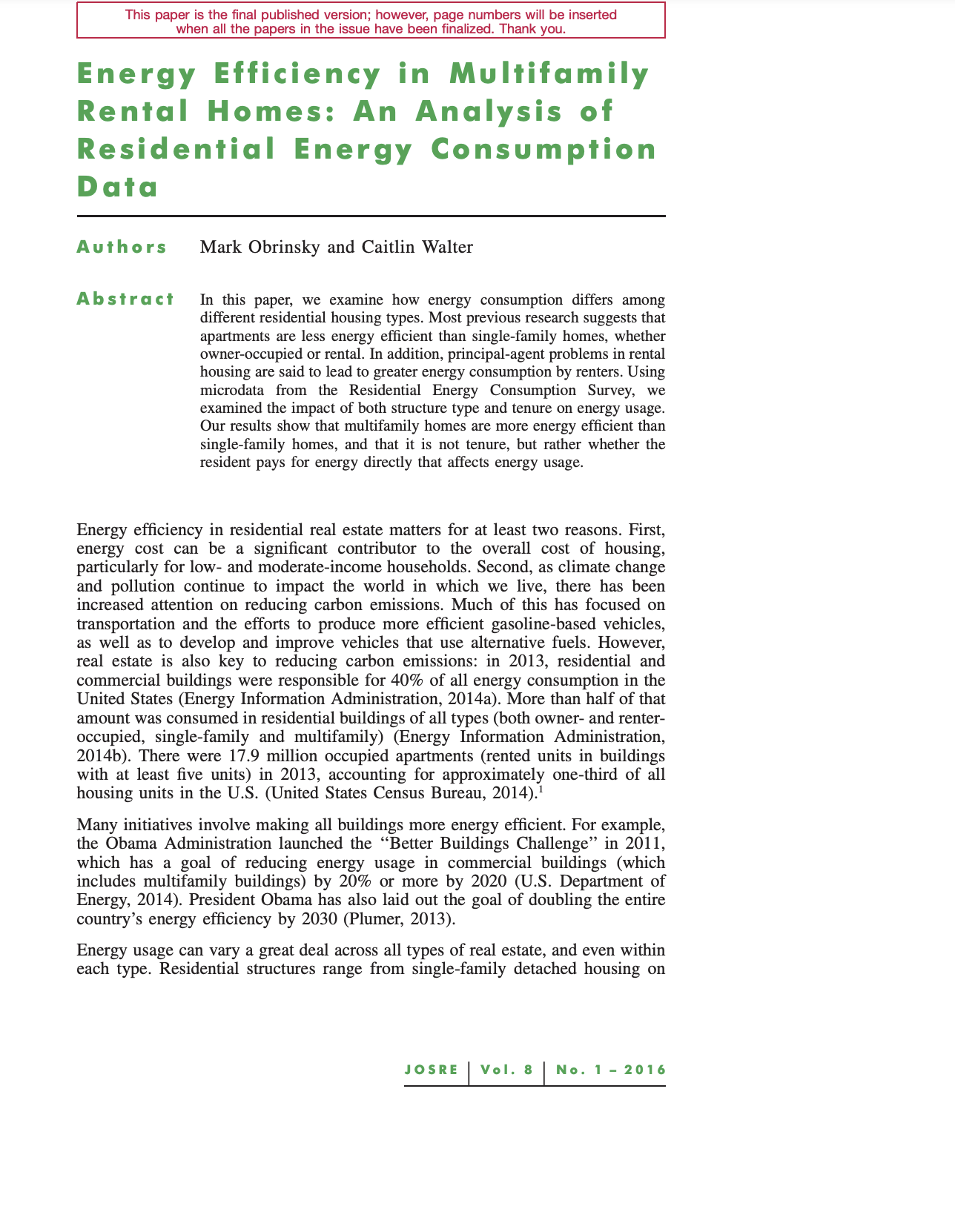 Energy Efficiency in Multifamily Rental Homes: An Analysis of Residential Energy Consumption Data