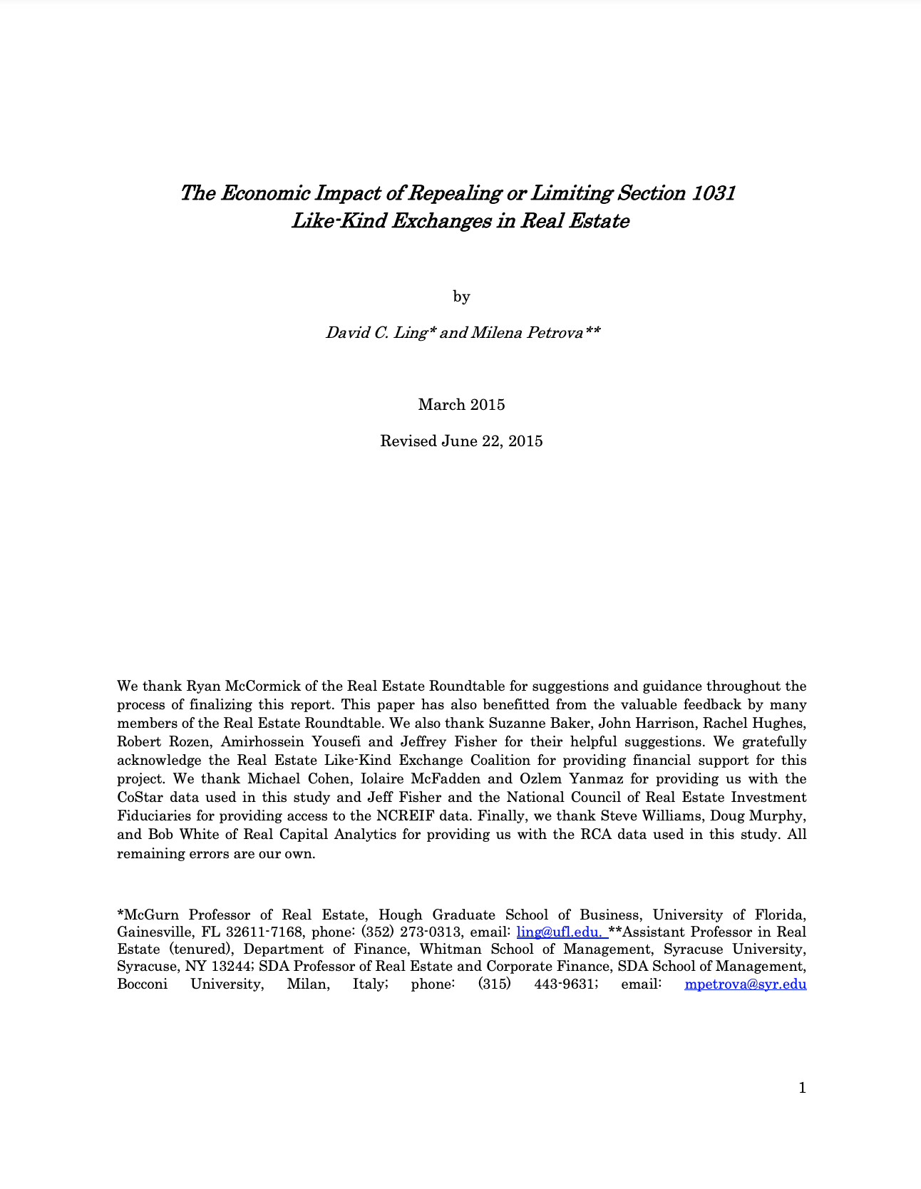 The Economic Impact of Repealing or Limiting Section 1031 Like-Kind Exchanges in Real Estate