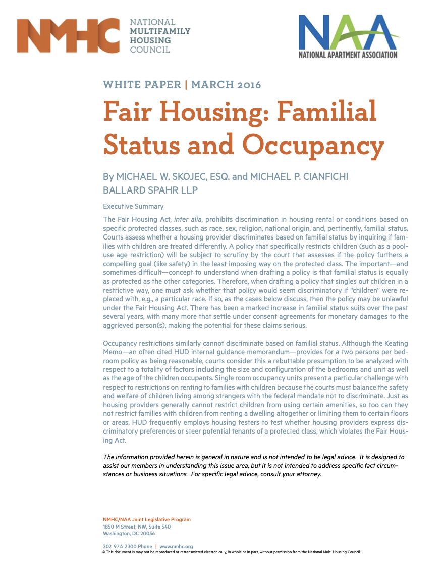 NMHC and NAA Fair Housing White Paper on Familial Status and Occupancy