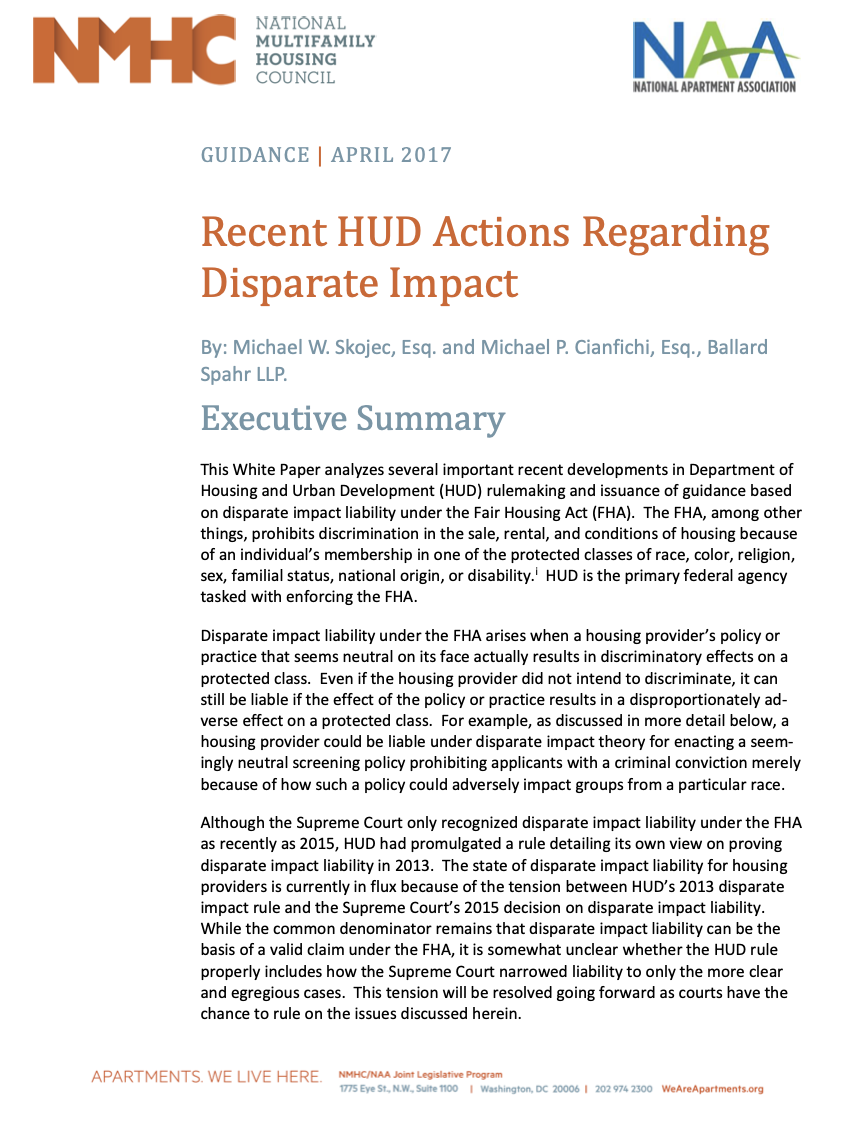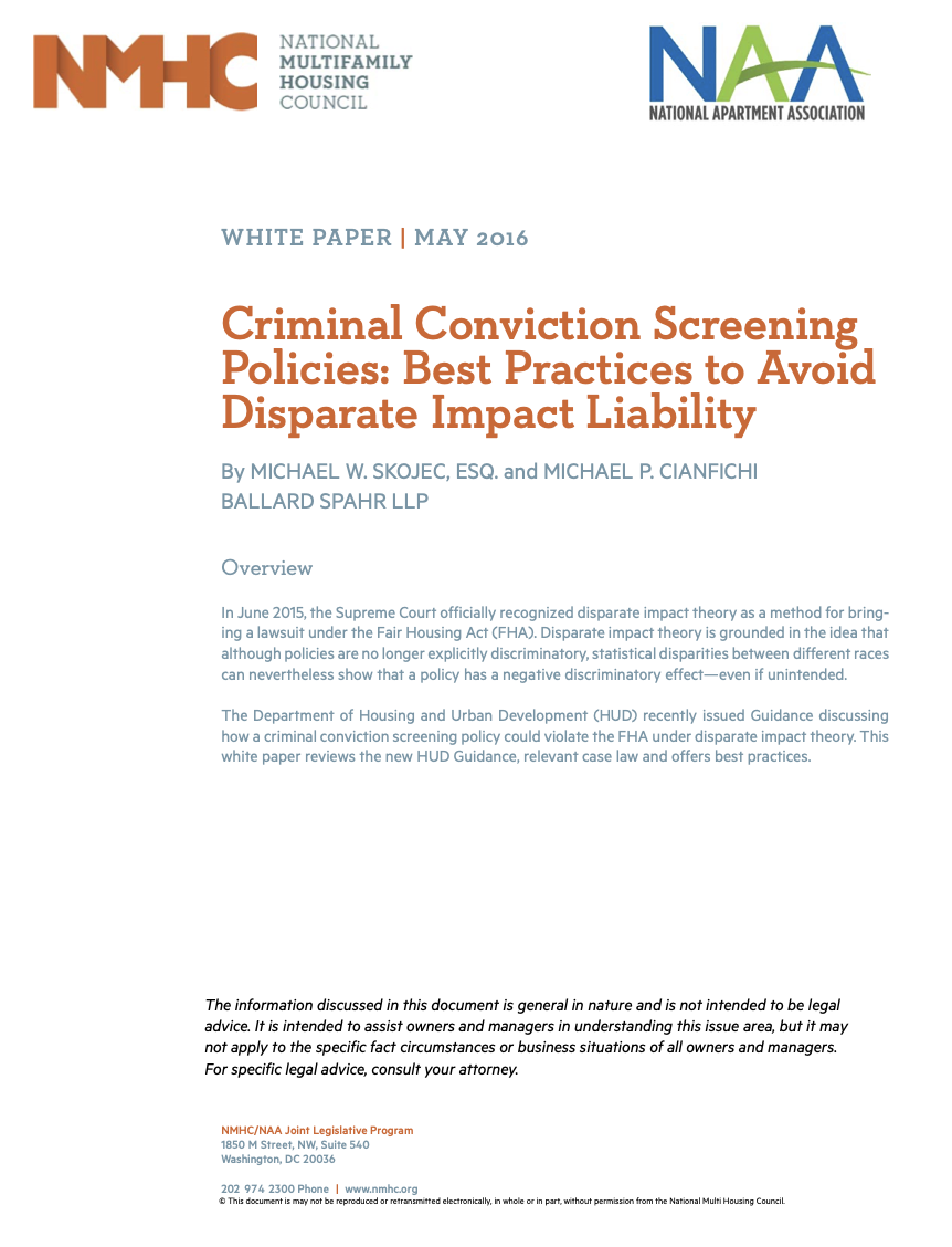 The NMHC and NAA new white paper entitled, Criminal Conviction Screening Policies: Best Practices to Avoid Disparate Impact Liability, provides a detailed analysis of HUD’s recent fair housing guidance on criminal screening. HUD’s new policy seeks to extend protections for individuals with criminal histories by ending blanket exclusions of prospective residents based on criminal history in favor of a more individualized approach that is more narrowly tailored to achieve property safety and security goals.