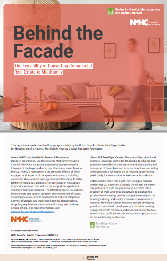 This joint NMHC/Urban Land Institute research report examines the feasibility and potential of repurposing unused and underutilized commercial real estate (CRE) structures—offices, hotels, retail, etc. –into housing to help address the nation’s housing crisis.