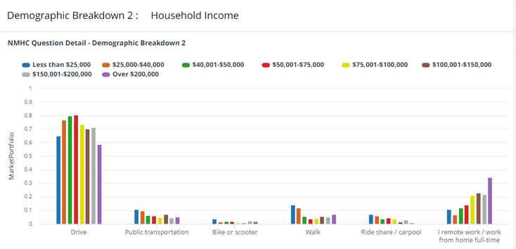If multiple markets have been selected, the y-axis of the chart will display the averages of those markets. For example, if a user is looking at commuting method by income, the y-axis of the chart will show the average use of that commuting method, for each age group, of all markets selected. The label will appear as “MarketPortfolio.” Here’s an example.